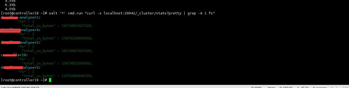 问题:在每个节点上执行curl -s localhost:20042/_cluster/stats?pretty | grep -A 1 fs得到的数据不一样