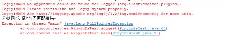 public static List<String> suggest(String keyword) { CompletionSuggestionBuilder suggest = new CompletionSuggestionBuilder("suggest").field("suggest").text(keyword).size(10); SearchRequestBuilder request = client.prepareSearch("medcl").setTypes("folks").addSuggestion(suggest); SearchResponse response = request.get(); List<String> words = Lists.newArrayList(); for( Entry< extends Option> entry : response.getSuggest().getSuggestion("suggest").getEntries()) { for( Option option : entry.getOptions()) { words.add(String.valueOf(option.getText())); } } return words; } public static void main(String args) { String keywords = {"刘德华", "liudehua"}; for (String keyword : keywords) { List<String> words = suggest(keyword); System.out.print("关键词[" + keyword + "]"); if (words.isEmpty()) { System.out.println("无匹配结果~"); } else { System.out.println("联想词分别为:" + words.toString()); } } - 当keyword为"刘德华"时,无结果